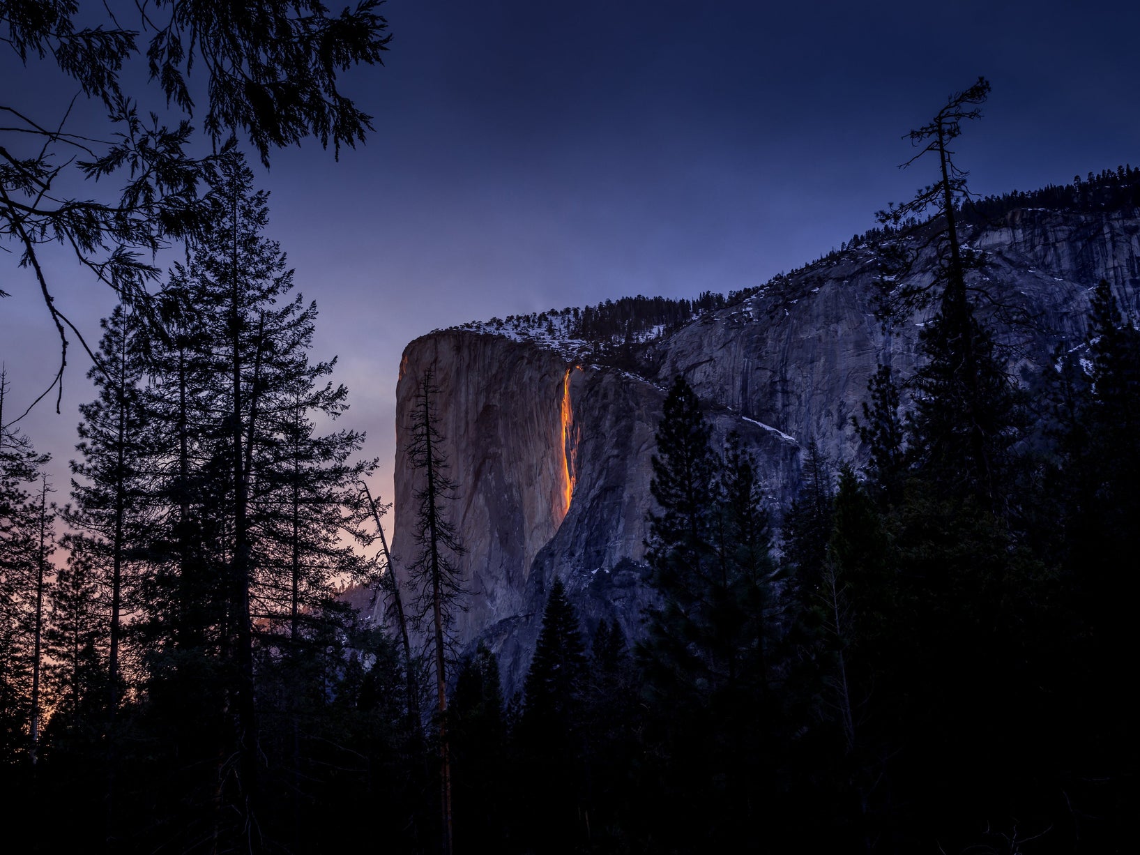 My first night in the park, wind blew the waterfall away and it didn't happen. On day two, clouds blocked the sun 20 minutes before sunset. The unspoken vibe from the other three photographers at our out of the way spot was, "maybe not tonight." But then, the clouds parted. It was like the waterfall was made of gas and someone threw in a match. Hundreds of people in the valley started to cheer, like their favorite rockstar had just taken the stage.
