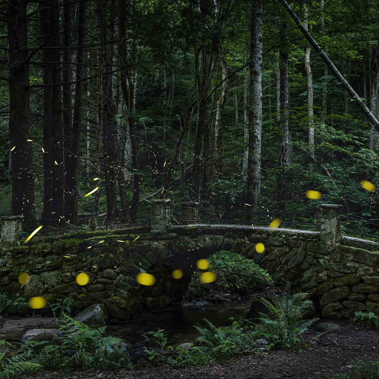 My mission for taking pictures of the Great Smoky Mountains was to find a nice composition, and just try to keep the shutter firing. There are many ruins and follies in the Elkmont area, and none prettier than this old bridge crossing a stream. Situated under the trees in the heart of the firefly habitat, it was perfect. The synchronous fireflies floated and flashed in a full 360 degrees around us, mostly unobstructed by undergrowth.